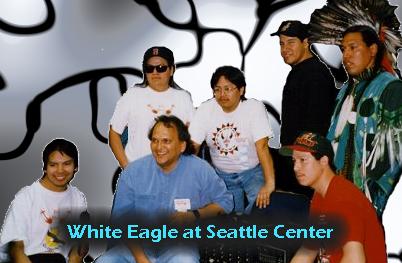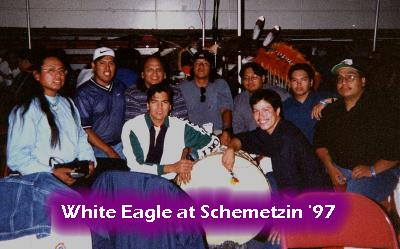 At Schemitzin 1998 World Singing Championships, the White Eagles placed 10th in the Hand Drumming Competition and 9th in the Northern Original Style.  In addition, the White Eagles are accomplished performers and teachers and have conducted classes and workshops on Native music and dance.  They have also recorded and toured with the award-winning Songcatchers, winners of the 1994 First Americans in the Arts Outstanding Musical Achievement  Award; as well as touring and opening for the Neville Brothers, Heart, CCR, Tower of Power and touring with Peter Gabriel’s WOMAD.  They are available to youth groups, community centers, or US reservation and Canadian band office programs.  Please call for information on scheduling them as Host Drum or to conduct a workshop.